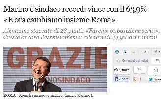 Roma ha un nuovo sindaco. Come nelle previsioni alla vigilia del ballottaggio, ha vinto il candidato di centro sinistra Ignazio Marino. Alcune testate giornalistiche molto autorevoli si sono lasciate andare a titoloni dai toni forse eccessivi. Il Corriere della Sera ha usato per esempio in prima pagina la parola “trionfo”, mentre l’articolo sottolineava che Marino è “sindaco record”, avendo vinto col 69,3%.