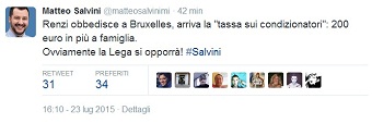 Da qui il twitt: “Renzi obbedisce a Bruxelles, arriva la "tassa sui condizionatori": 200 euro in più a famiglia. Ovviamente la Lega si opporrà! #Salvini”. La cosa non passa inosservata e la stampa.it predispone un pezzetto giornalistico, documentando la doppia bufala: primo, la tassa riguarda i grandi impianti e non le abitazioni e quindi il cittadino comune; secondo, la norma è stata già introdotta, seguendo appunto una direttiva europea, dal governo Monti.