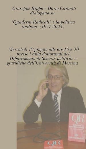 Mercoledi 19 giugno alle ore 10:30 presso l'aula dottorandi del Dipartimento di Scienze politiche e giuridiche dell'Università di Messina il prof. Dario Caroniti, docente Unime ha dialogato con Giuseppe Rippa, direttore di Quaderni Radicali e Agenzia Radicale su"Quaderni Radicali e la politica italiana (1977-2024)”.