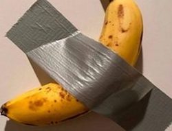 «Il mio è un gesto d’artista - ha detto - si chiama “Hungry Artist”». “Arte nell’arte: doppia arte a grandi livelli per una banana di mediocre qualità, relativamente piccola, attaccata con un nastro adesivo grigio metallizzato a mo’ di X su una parete bianca, è la nuova trovata di un noto provocatore dell’arte contemporanea, Maurizio Cattelan che intende dimostrare il disvalore dell’arte.