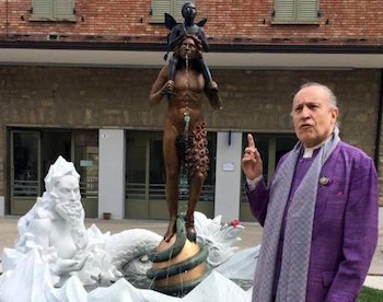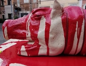 La porchetta a piazza della Malva a Roma, scultura dell’artista Amedeo Longo, fresco d’ accademia non sembra affatto interessante. L’opera ha ricevuto la derisione dei cittadini, al punto che l’artistica porchetta è stata vandalizzata dagli animalisti con la vernice rossa. A tale riguardo, ma in senso diametralmente opposto, ricordo che proprio in un paesino della provincia di Bologna, a Vergato, qualche anno fa fu molto contestata dalla gente del posto una fontana con un gruppo scultoreo di Luigi Ontani, uno degli artisti contemporanei viventi più importanti che abbiamo, con l’intento di farla rimuovere (eppure si parla di uno che ha opere sparse nei più importanti musei del mondo). Devo dire che l’esorcista, pittoresco personaggio del luogo che ha imbrattato di sterco la fontana di Vergato, ha superato Luigi Ontani come performer, in esagerazione.