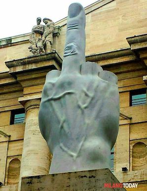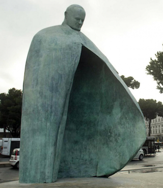 Mentre a Milano il “Dito medio” di Maurizio Cattelan, grande mano di marmo alta dieci metri collocata davanti la prestigiosa sede della Borsa, chiusa eccetto il dito medio ad esprimere il chiaro messaggio grillino del vaffa, nonostante lo sdegno che indubbiamente crea, non si parla affatto di toglierla. “Storica” è stata la statua di Wojtyła, Papa Giovanni Paolo II, realizzata da Oliviero Rainaldi per il Giubileo del 2000, fatta a “porchetta”, così tozza che sembra da farcire, posta strategicamente alla stazione Termini, che offre a chi arriva in treno a Roma il cosiddetto esempio dello stato dell’arte.