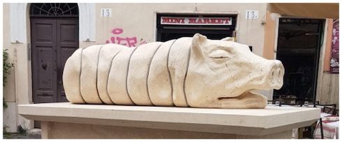 La recente ventata populista ha creato delle novità che si sono tradotte in opere pubbliche di dubbio valore che hanno scatenato l’indignazione della gente e di molti addetti ai lavori. Cito ad esempio l’articolo di Massimiliano Antonelli comparso su Artribune su alcune sculture e in particolare su una gigantesca porchetta in pietra apparsa nell’antico centro storico grazie a “Piazze romane”, progetto dell’amministrazione capitolina, disapprovazione che mi trova completamente d’accordo.
