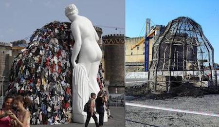 L'alta quanto inarrivabile arte contemporanea si dissolve in una nuvola di fumo. Chissà perché per secoli le statue le hanno fatte in marmo o in bronzo, Mah, quisquiglie d'arte classica. Ci si è fatto tanto vanto di usare materiali ordinari che adesso ci si stupisce delle conseguenze; considerati i materiali usati poteva bruciare anche per autocombustione (tutto è possibile in una torrida estate a Napoli, col cambiamento climatico).