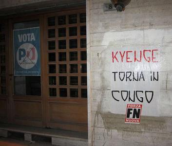 ''Kyenge torna in Congo'': i militanti di Forza Nuova all'attacco della neoministra all'Integrazione. Succede a Macerata, davanti alla sede del Pd, dove il movimento di estrema destra ha affisso il volgare manifesto come forma di protesta contro la proposta del senatore Mario Morgoni di concedere la cittadinanza onoraria a Cecile Kyenge.