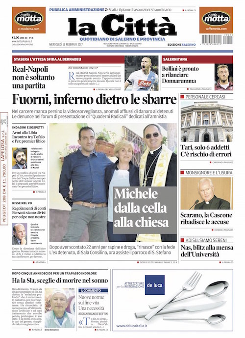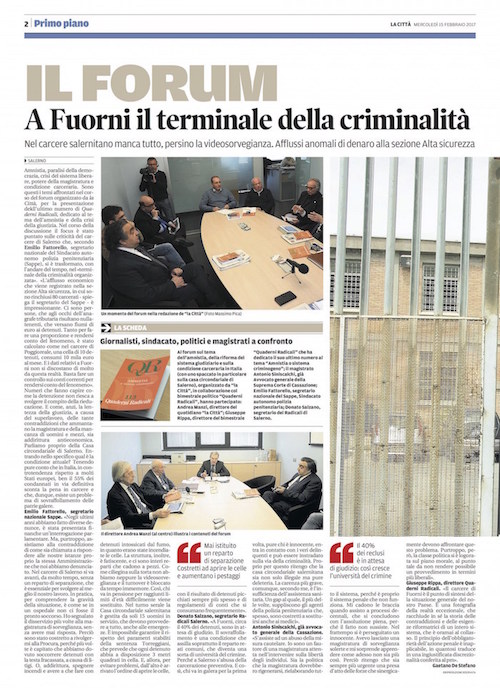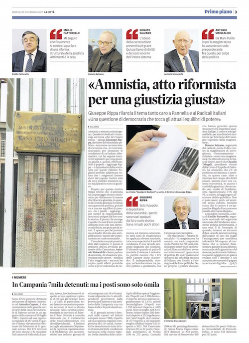 Al forum sul tema dell’amnistia, della riforma del sistema giudiziario e sulla condizione carceraria in Italia (con uno spaccato in particolare sulla casa circondariale di Salerno), organizzato da “la Città”, in collaborazione col bimestrale politico “Quaderni Radicali”, hanno partecipato: Andrea Manzi, direttore del quotidiano “la Città”; Giuseppe Rippa, direttore del bimestrale “Quaderni Radicali” che ha dedicato il suo ultimo numero al tema “Amnistia o sistema criminogeno”; il magistrato Antonio Siniscalchi, già Avvocato generale della Suprema Corte di Cassazione; Emilio Fattorello, segretario nazionale del Sappe, Sindacato autonomo polizia penitenziaria; Donato Salzano, del Partito Radicale Nonviolento, Transnazionale e Trasparito di Salerno.